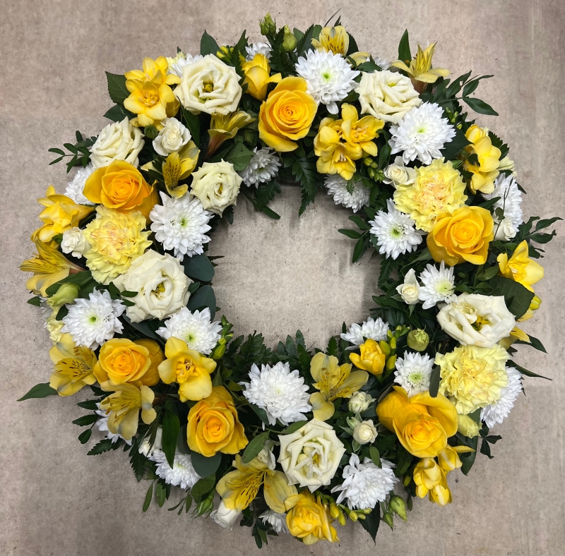 A floral wreath using fresh seasonal flowers in yellow and white shades with beautiful yellow roses.