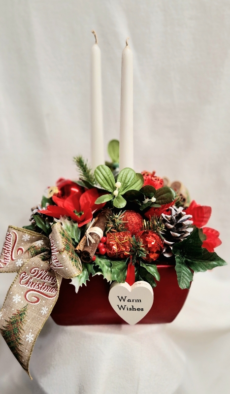 A festive Christmas arrangement in a red ceramic container, with two central candles. Perfect for your table centrepiece.