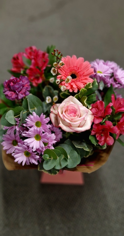 A bespoke handtied bouquet of seasonal flowers in pink shades.