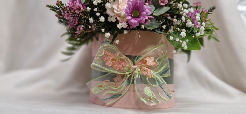 Our stunning hatbox arrangement perfect for a low maintenance gift that can be enjoyed straight away with a choice of chocolates